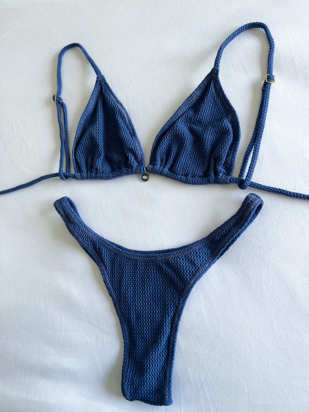 Feita em tecido premium com fio Lycra, oferece leveza, toque gelado e delicada textura creponada com brilho suave, perfeita para praia e exercícios.