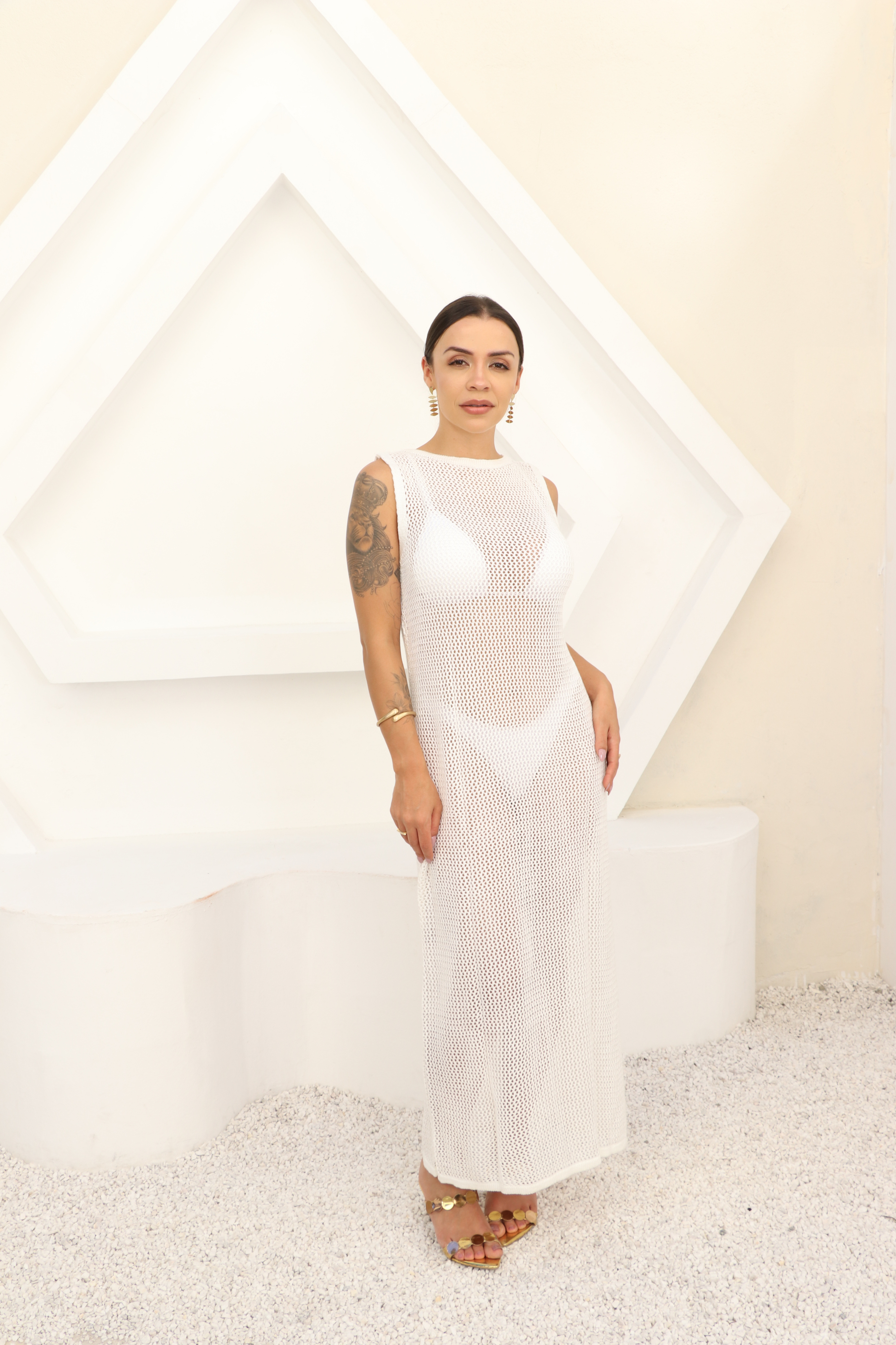 A modelagem longa, sem mangas, abraça o corpo com fluidez e garante conforto absoluto, enquanto a transparência sutil do tricô realça o biquíni por baixo, criando uma composição chic e minimalista para praia, resort ou sunset.